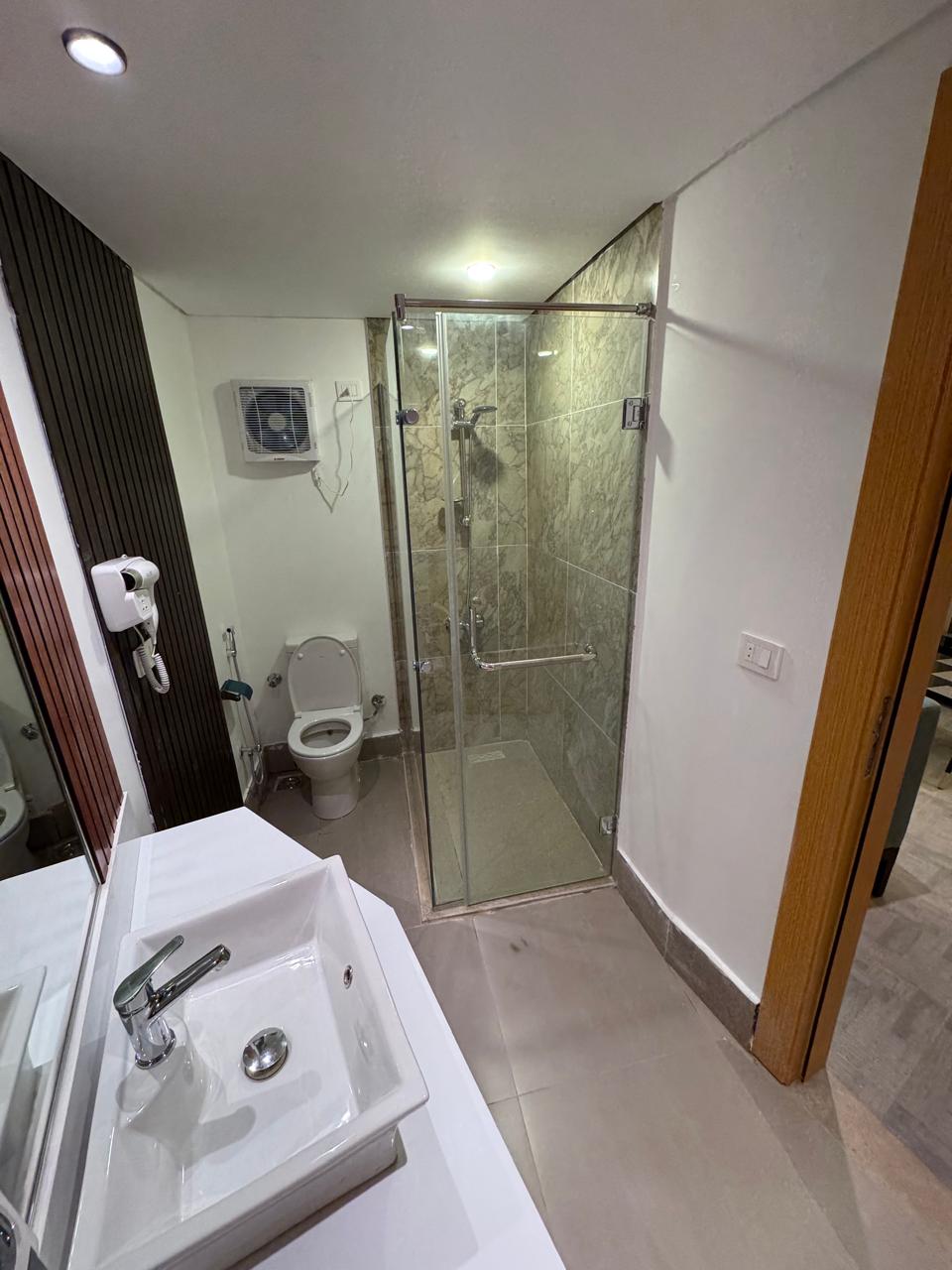 Bathroom and toilet with shower cabin